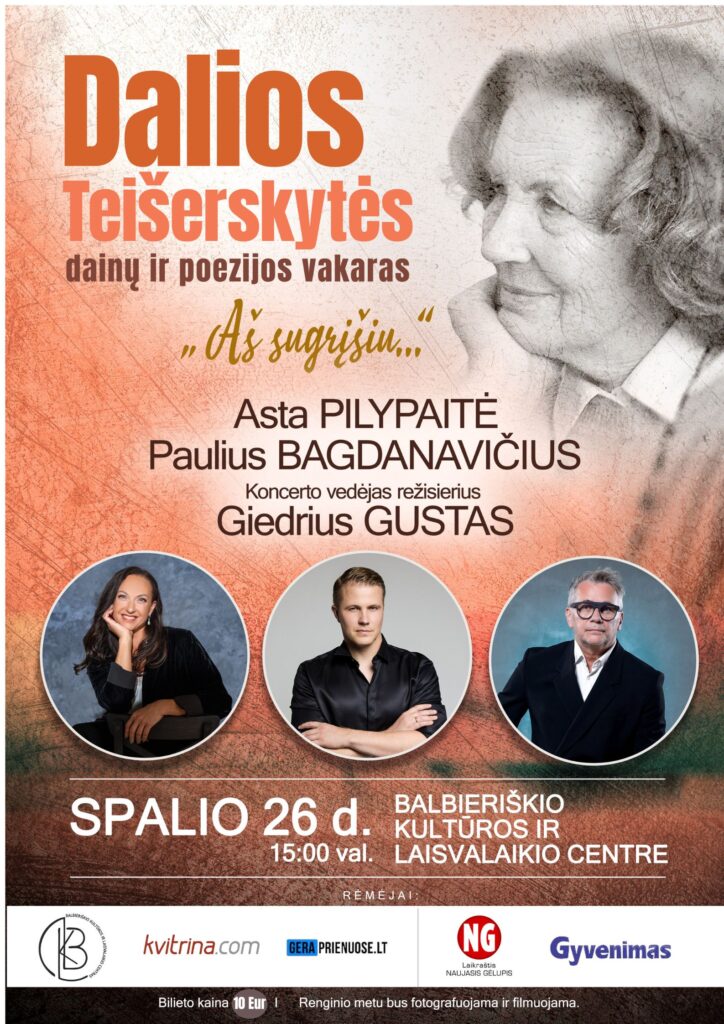 Home Renginiai Koncertai Dalios Teišerskytės dainų ir poezijos vakaras „Aš sugrįšiu…“ Dalios Teišerskytės dainų ir poezijos vakaras „Aš sugrįšiu…“ Kviečiame į ypatingą vakarą! Dalios Teišerskytės dainų ir poezijos vakaras „Aš sugrįšiu…“ Spalio 26 d. (Sekmadienis) 15:00 val. Balbieriškio kultūros ir laisvalaikio centre Atlikėjai: Asta Pilypaitė Paulius Bagdanavičius Koncerto vedėjas ir režisierius – Giedrius Gustas Bilieto kaina – 10 € Renginio metu bus fotografuojama ir filmuojama. + Add to Google Calendar + iCal / Outlook export Date 2025-10-26 Time 15:00 Kategorijos Koncertai