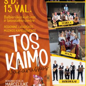 Gegužės 3 d. 15 val. kviečiame į regioninę liaudiškos muzikos kapelų šventę „Tos kaimo vakarūškos“! Balbieriškio kultūros ir laisvalaikio centre Dalyvauja: „Vaivora“, „Temela“, „Svaja“, „Dziedukai“, „Šerkšnas“ Renginio vedėja – Marceliukė Bilieto kaina – 5 Eur Laukia gyva muzika, gera nuotaika ir tikra kaimo vakaruškų atmosfera!